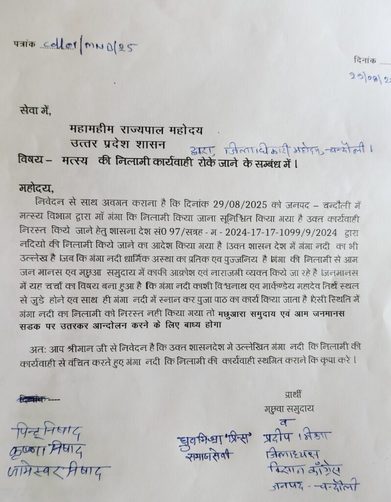 Chandauli News-माँ गंगा की मछली निकालने हेतु हो रही नीलामी के खिलाफ मछुआरा समाज एकजुट,डीएम को सौंपा ज्ञापन