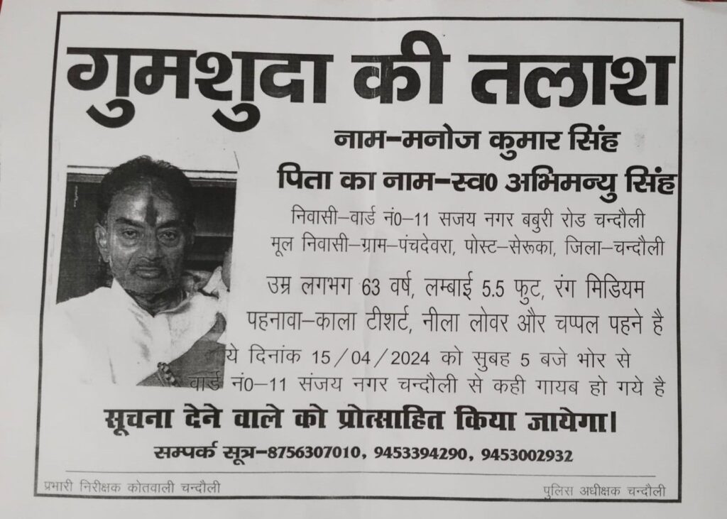 उनकी पत्नी उसके बाद से लगातार खोजबीन कर रही हैं। पति के गुमशुदा होने के दिन ही उन्होंने चंदौली कोतवाली पहुंच पति के गुमशुदगी को थानाध्यक्ष के संज्ञान में लाया। उन्होंने कहा हम काफी अकेले और परेशान हैं। पति को गुम हुए करीबन 3-4 महीना हो गया लेकिन अभी तक उनका पता नहीं चल पाया है। आपको बता दें महिला अपने पति का पोस्टर लेकर जगह-जगह जाकर लोगों को दिखाकर जानकारी लेती रही लेकिन प्रतिदिन घंटो भटकने के बाद पति का पता नहीं चल पाया है जिससे वह काफी मायूस और परेशान है। महिला ने कहा अगर किसी को उनकी जानकारी हो तो इस नंबर 8756307010,9453394290,9453002932 पर संपर्क कर मदद करे।