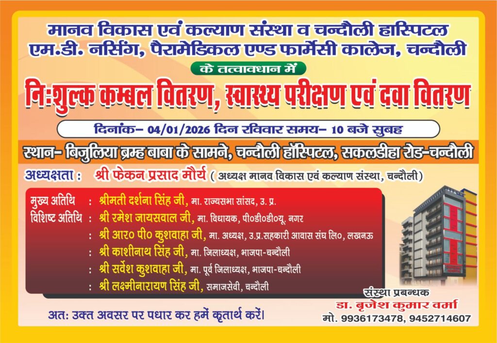 चंदौली -मानव विकास एवं कल्याण संस्था द्वारा संचालित चंदौली हॉस्पिटल एवं एमडी नर्सिंग कॉलेज, सकलडीहा रोड, चंदौली के सभागार में हर वर्ष की भांति इस वर्ष भी गरीबों एवं असहायों को कंबल वितरण, निःशुल्क स्वास्थ्य परीक्षण एवं दवा वितरण कार्यक्रम का आयोजन किया गया।कार्यक्रम का शुभारंभ दीप प्रज्वलन के साथ हुआ।कार्यक्रम की मुख्य अतिथि राज्यसभा सांसद दर्शना सिंह ने उपस्थित जनसमूह को संबोधित करते हुए कहा कि यह संस्था पिछले 25 वर्षों से निरंतर कंबल वितरण जैसे पुनीत कार्य कर रही है, जो अत्यंत सराहनीय है। ऐसे सामाजिक कार्यों से समाज के सक्षम लोगों को भी सेवा एवं सहयोग की प्रेरणा मिलती है। उन्होंने कहा कि भारतीय जनता पार्टी का मूल मंत्र “सबका साथ, सबका विकास” है और सरकार अंतिम पायदान पर खड़े व्यक्ति तक योजनाओं का लाभ पहुंचाने के लिए प्रतिबद्ध है।विशिष्ट अतिथि पंडित दीनदयाल उपाध्याय नगर के विधायक रमेश जायसवाल ने कहा कि नर सेवा ही नारायण सेवा है। इस भीषण ठंड में वस्त्रदान एवं अन्नदान से बड़ा कोई दान नहीं है। डॉ. बृजेश कुमार वर्मा द्वारा पिछले 25 वर्षों से किया जा रहा यह कार्य वास्तव में प्रशंसनीय है।अध्यक्षीय भाषण में प्रमुख समाजसेवी लक्ष्मी नारायण सिंह उर्फ मुन्ना सिंह ने कहा कि आज समाज में बढ़ती विकृतियों से बचाव का एकमात्र मार्ग दान एवं परोपकार है। धर्म और सेवा करने वाला व्यक्ति ही समाज में सफल और जीवित रहता है।संस्था के अध्यक्ष डॉ. बृजेश कुमार वर्मा ने अतिथियों का स्वागत करते हुए कहा कि जनसहयोग और आशीर्वाद से यह पुनीत कार्य लगातार 25 वर्षों से किया जा रहा है और आगे इसे और व्यापक रूप देने का संकल्प है। उन्होंने कहा कि संस्था एवं अस्पताल हमेशा जनमानस के सुख-दुख में सहभागी रहेगा।कार्यक्रम में नर्सिंग कॉलेज की छात्राओं द्वारा सरस्वती वंदना एवं स्वागत गीत की सुंदर प्रस्तुति दी गई। वहीं भोजपुरी के प्रसिद्ध गायक राकेश यादव एवं उनकी टीम की शानदार प्रस्तुति ने उपस्थित जनसमूह का मन मोह लिया।इस अवसर पर कुल 700 कंबलों का वितरण किया गया। कार्यक्रम का संचालन डॉ. जितेंद्र मौर्य ने किया।