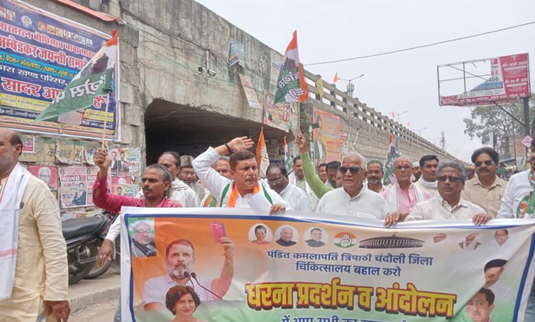 Chandauli News-जिला अस्पताल का वजूद बचाने सड़क पर उतरी कांग्रेस,निकाला विरोध मार्च