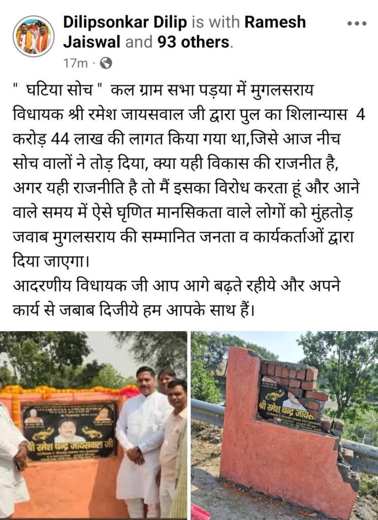 चंदौली -जिला पंचायत सदस्य दिलीप सोनकर ने ग्राम सभा पड़या के पास पुल के शिलान्यास स्थल को तोड़े जाने की घटना पर तीखी प्रतिक्रिया व्यक्त की है। उन्होंने इसे घटिया और निंदनीय सोच का परिणाम बताते हुए कहा कि मुगलसराय विधायक रमेश जायसवाल द्वारा 4 करोड़ 44 लाख रुपये की लागत से पुल निर्माण का शिलान्यास किया गया था, जिसे कुछ असामाजिक तत्वों ने नुकसान पहुंचाया। सोनकर ने सवाल उठाया कि क्या यही विकास की राजनीति है।उन्होंने स्पष्ट कहा कि यदि इस प्रकार की राजनीति जारी रही तो इसका कड़ा विरोध किया जाएगा। साथ ही उन्होंने चेतावनी दी कि आने वाले समय में ऐसी घृणित मानसिकता रखने वालों को मुगलसराय की जागरूक जनता और कार्यकर्ता मुंहतोड़ जवाब देंगे। दिलीप सोनकर ने विधायक रमेश जायसवाल का समर्थन करते हुए कहा कि वे अपने विकास कार्यों को जारी रखें, जनता उनके साथ खड़ी