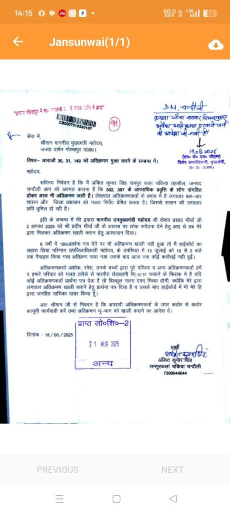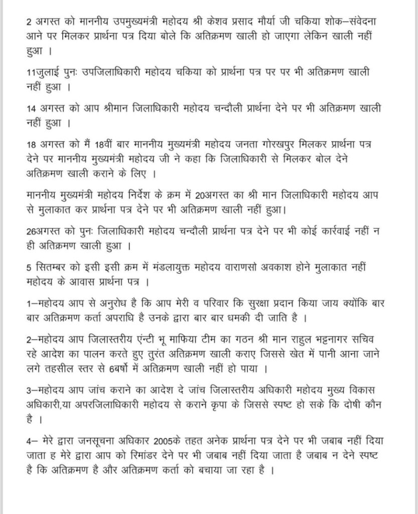 जनसूचना अधिकार अधिनियम 2005 के तहत भी कई बार आवेदन किए गए, लेकिन अधिकारियों द्वारा कोई जवाब नहीं दिया गया।13 जुलाई को स्वयं उपजिलाधिकारी की उपस्थिति में पैमाइश हुई जिसमें अतिक्रमण की पुष्टि हुई, फिर भी कार्यवाही नहीं हुई।2 अगस्त एवं पुनः अगस्त माह में उपमुख्यमंत्री केशव प्रसाद मौर्य से मुलाकात कर अतिक्रमण हटाने का अनुरोध किया गया, पर कोई कार्रवाई नहीं।18 अगस्त को पीड़ित ने मुख्यमंत्री योगी आदित्यनाथ जी से गोरखपुर जनसुनवाई में मिलकर आदेश दिलवाया कि अतिक्रमण हटवाया जाए। मुख्यमंत्री के निर्देश के बाद 20 अगस्त को जिलाधिकारी से मुलाकात हुई, लेकिन स्थिति जस की तस रही।26 अगस्त को पुनः जिलाधिकारी को आवेदन दिया गया, लेकिन फिर भी अतिक्रमण नहीं हटाया गया।5 सितम्बर को मंडलायुक्त वाराणसी के अवकाश में न होने के कारण उनके आवास पर भी प्रार्थना पत्र दिया गया।