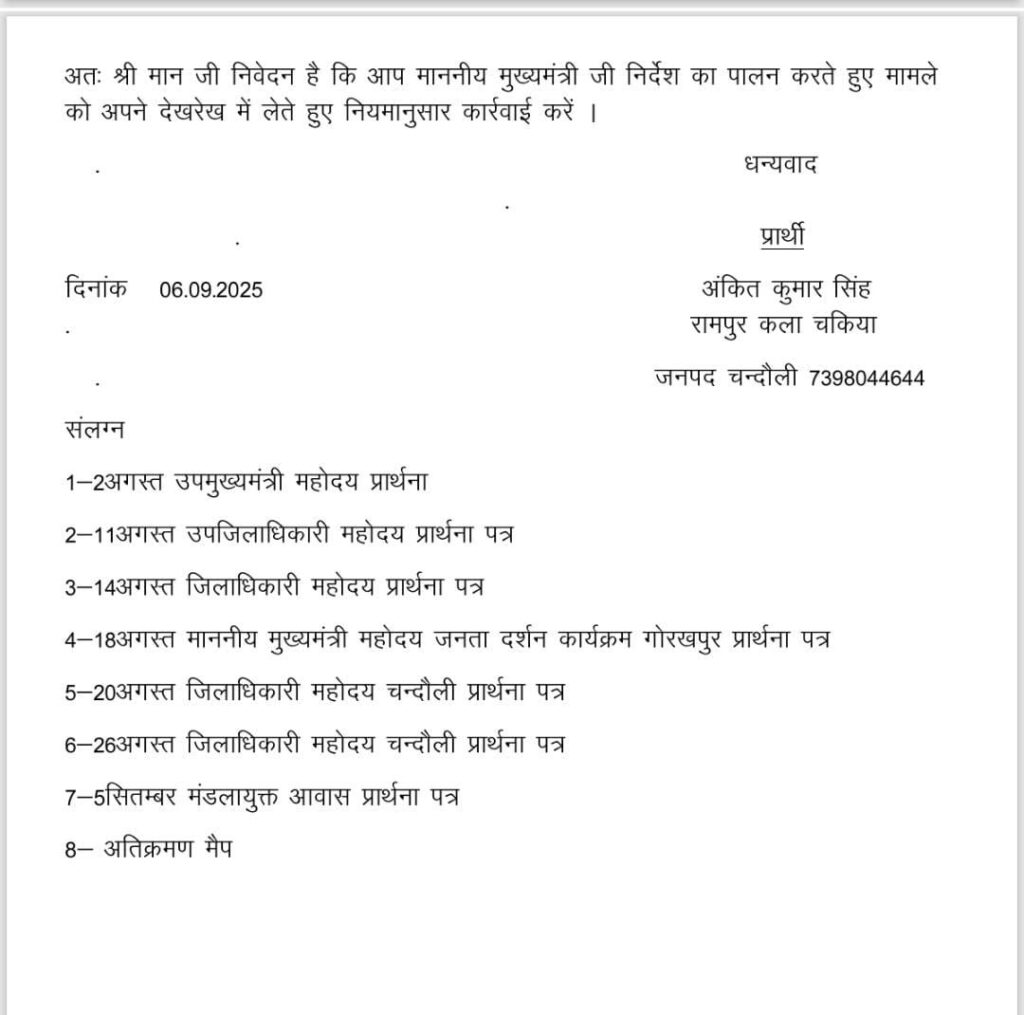 चकिया (जनपद चंदौली)। तहसील चकिया के ग्राम रामपुर कला निवासी अंकित कुमार सिंह, जो वर्तमान में बेसिक शिक्षा परिषद, उत्तर प्रदेश सरकार में सहायक अध्यापक पद पर कार्यरत हैं, ने जिलाधिकारी, उपजिलाधिकारी, उपमुख्यमंत्री, मुख्यमंत्री, मंडलायुक्त सहित शासन के विभिन्न स्तरों पर लगभग 200 बार प्रार्थना पत्र देकर अपनी कृषि भूमि से संगठित अपराधियों द्वारा किए गए अतिक्रमण को हटाने की मांग की, परंतु अब तक कोई ठोस कार्यवाही नहीं हुई है।